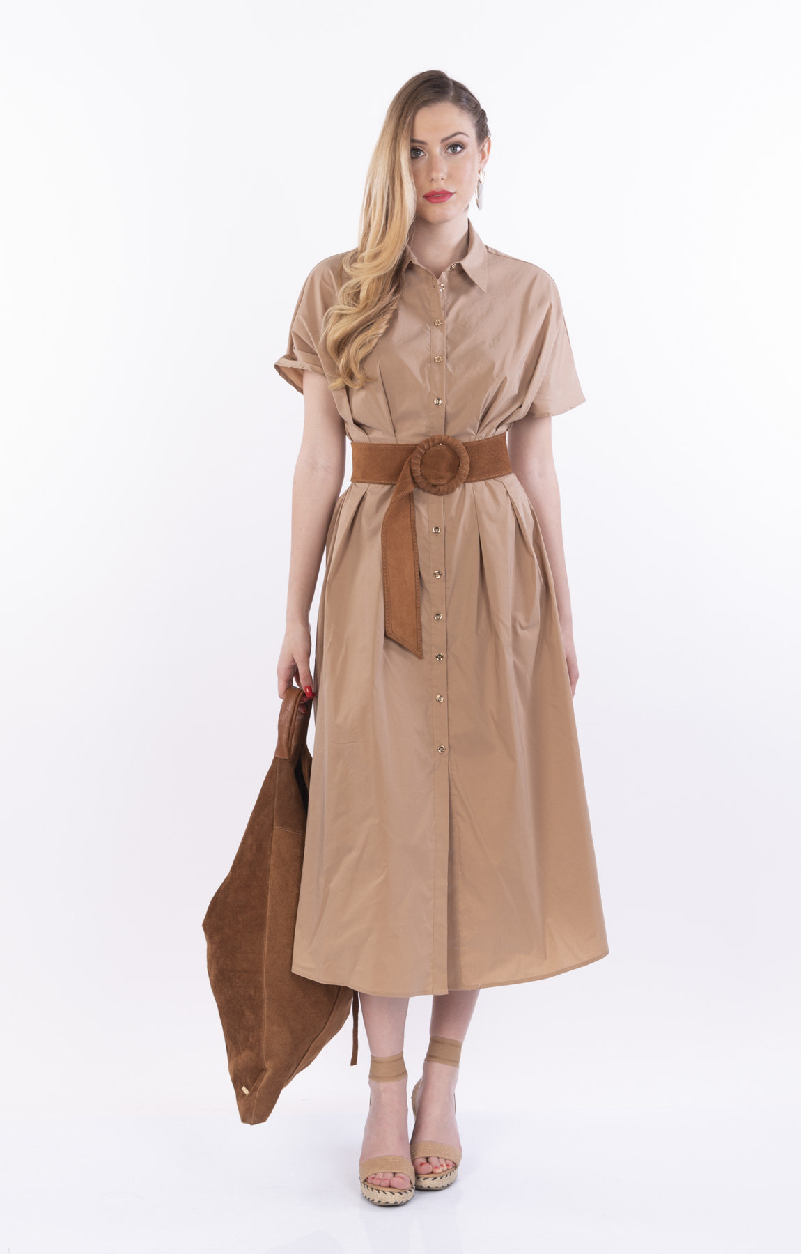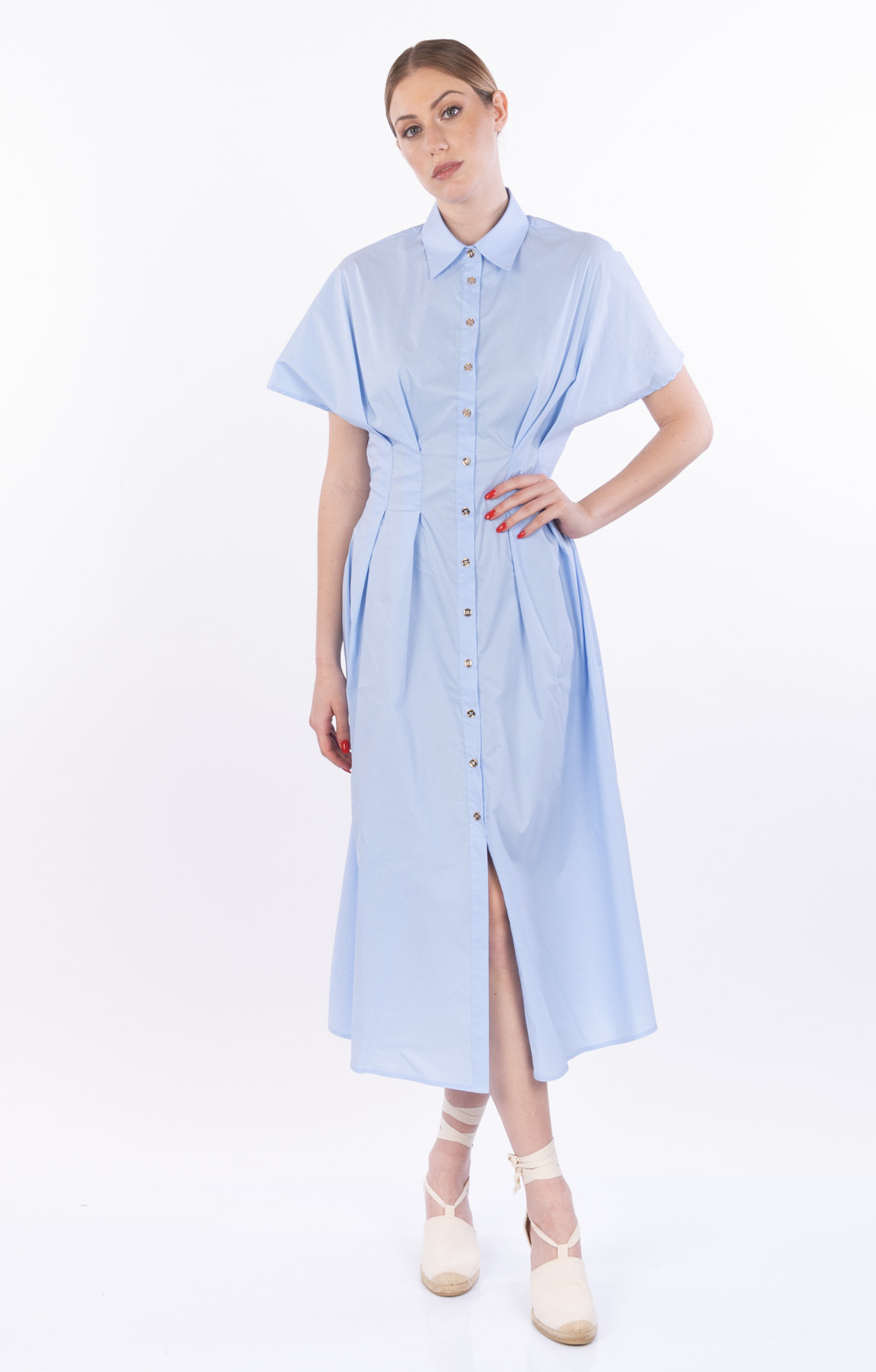ABITO/CAMICIA IN POELINE DI COTONE. MANICHE CORTE A KIMONO. TASCHE INSERITE NEL FIANCO. LUNGHEZZA MIDI. VESTIBILITA’ REGULAR. COMPOSIZIONE: 65% COTONE-35% POLIESTERE